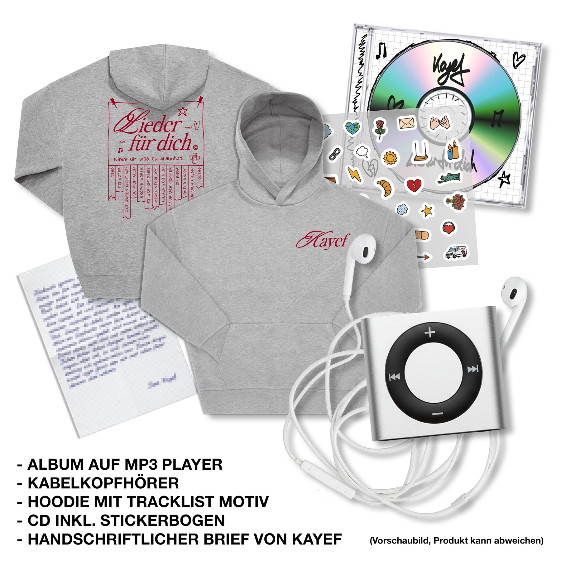 Jetzt vorbestellen! Das neue Album "LIEDER FÜR DICH" kommt ganz nostalgisch auf einemMP3 Player, natürlich mit passenden weißen Kopfhörern. Dazu gibt es die Album CD inklusive Stickerbogen, der die Lyrics aufgreift, mit dem du dein ganz individuelles Album Design basteln kannst. Abgerundet wird das Bundle mit einem persönlichen Brief von KAYEF.