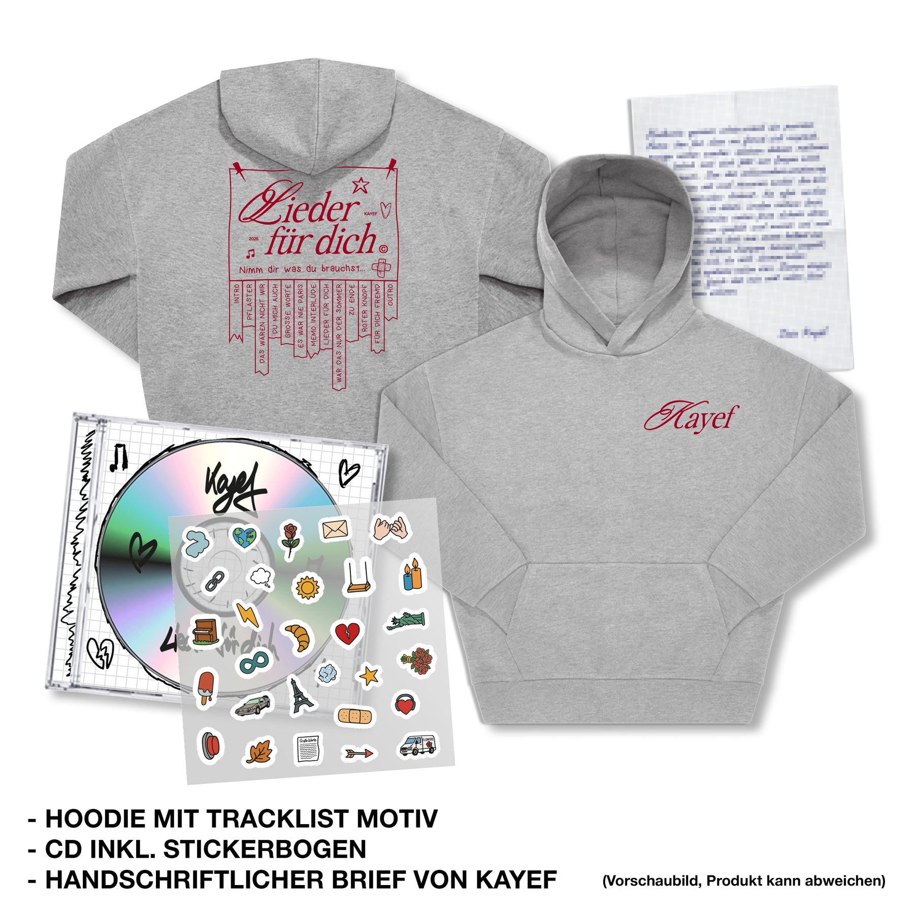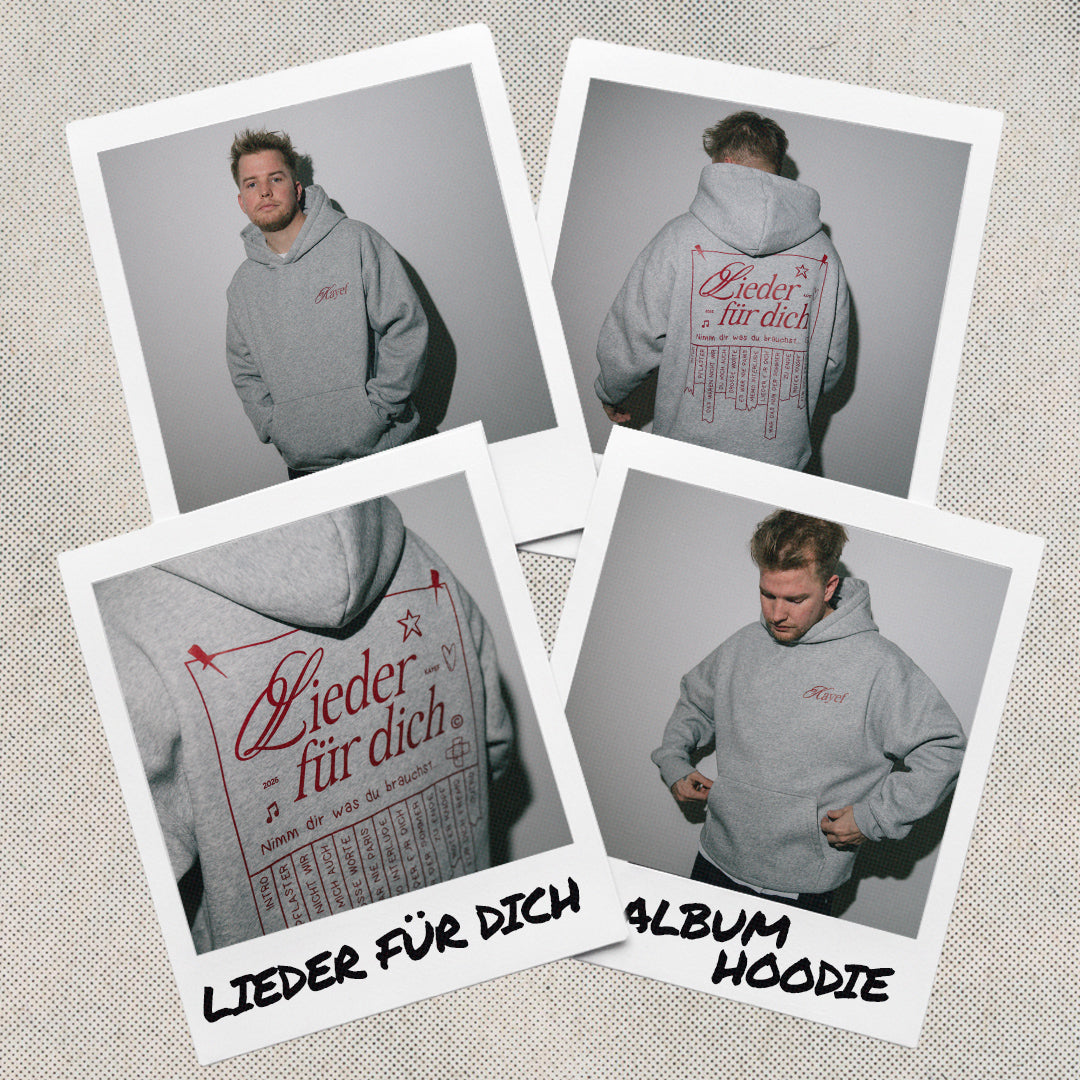 Jetzt vorbestellen! Das neue Album "LIEDER FÜR DICH" als CD inklusive Stickerbogen, passend zu den Lyrics mit dem du dein ganz individuelles Album Design basteln kannst. Dazu gibt es einen hochwertigen Oversized Hoodie, fair produziert mit einem Tracklist Motiv auf dem Rücken und Kayef Logo auf der Brust. Abgerundet wird das Bundle mit einem persönlichen Brief von KAYEF.